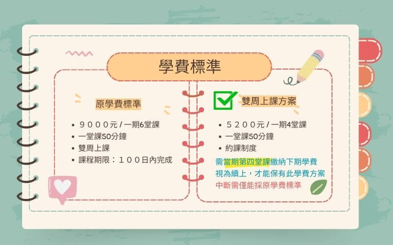 - 無續上意願亦可:可以不再當期最後一堂課繳納